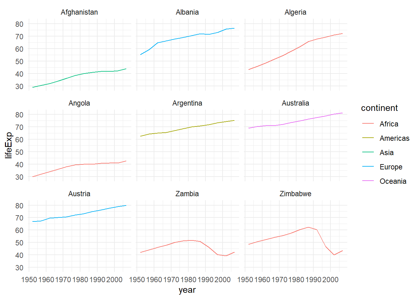 ggplot (aes (x = year, y = lifeExp, colour = continent)) +